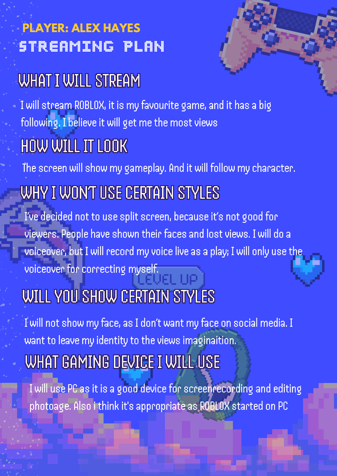 Hi, my name is Alex, and for my Arts Award Journey, I will be creating a YouTube channel about gaming. It will include me streaming the games I play. Throughout this journey, I will learn how to set up cameras, lighting, and edit my videos. I will be logging my journey along the way.