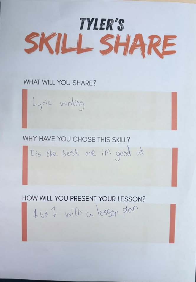 For my skill share I will be teaching how to write your own lyrics. Its something I like to do and I think I will be good at passing the skill on. I have spent time making a plan and a lesson plan